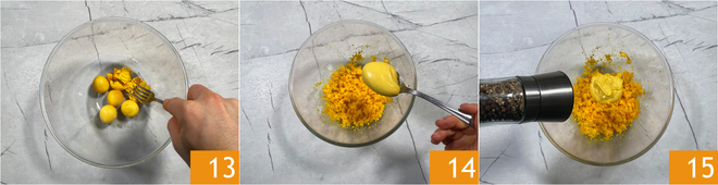 Amasse as gemas em uma tigela 13 e junte 100 gramas de maionese japonesa 14, sal e pimenta 15; misture bem.