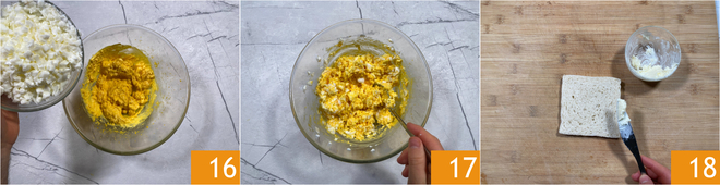 Adicione as claras picadas 16 e misture novamente 17. Espalhe 10 gramas de manteiga macia em cada uma das 8 fatias de pão 18.