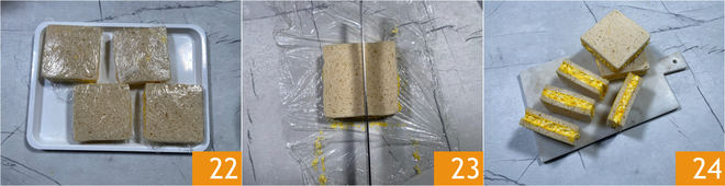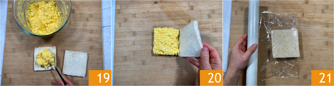 Então recheie com bastante a mistura de ovos 19 e feche juntando outra fatia untada 20. Envolva o sanduíche com filme plástico 21.
