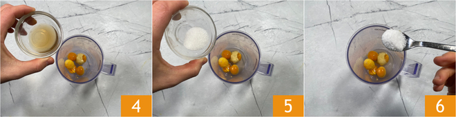 Adicione também o vinagre 4, o açúcar 5 e o sal 6.