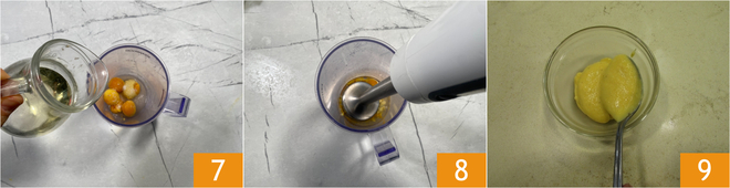 Por fim, despeje o óleo 7 e bata com o mixer de imersão 8 até obter um molho liso e consistente. Transfira para uma tigelinha e conserve na geladeira até o momento de usar 9.