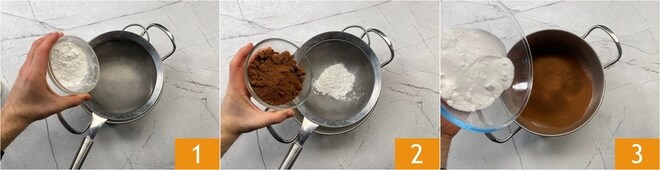 Para preparar o sanguinaccio doce, primeiro una os ingredientes secos em uma panela de aço de fundo grosso: com uma peneira, passe o amido de milho 1 e o cacau em pó 2, depois adicione o açúcar 3,