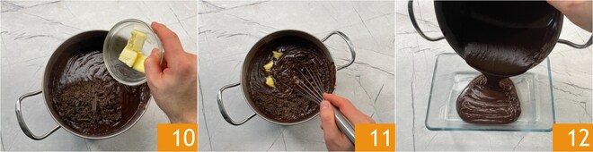 Adicione também a manteiga em pedaços 10, depois misture bem até que esteja completamente derretida 11. Neste ponto, transfira o creme para uma travessa grande e deixe esfriar um pouco 12.