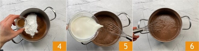 Aromatize com a canela em pó 4, despeje o leite frio 5 e misture com o batedor para incorporar e dissolver eventuais grumos 6.
