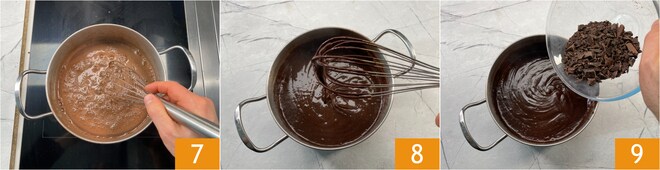 Vá para o fogão e cozinhe em fogo médio-alto por cerca de 5 minutos 7. É importante mexer continuamente, principalmente raspando bem as bordas. Assim que o molho mudar de consistência, retire a panela do fogo 8 e incorpore o chocolate picado 9.