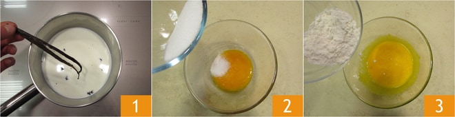 Para preparar a sbriciolada de morangos, comece pelo creme: aqueça o leite com as duas vagens de baunilha e as sementes internas 1. Deixe ferver. Enquanto isso, coloque as gemas em uma tigela, adicione o açúcar 2 e misture com um batedor. Adicione também a farinha 3.