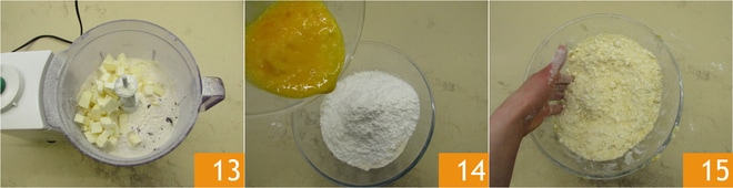 Adicione as sementes de uma vagem de baunilha, uma pitada de sal e a manteiga 13. Ligue o processador para misturar brevemente. Coloque a mistura em uma tigela, despeje os ovos batidos por cima 14. Amasse rapidamente com as mãos, tentando beliscar a massa 15.