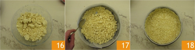 Você deve obter uma mistura esfarelada 16. Cubra a tigela com plástico filme e deixe descansar na geladeira por uma hora. Forre uma forma de 24 cm de diâmetro com papel manteiga, garantindo que o papel ultrapasse alguns cm a borda da forma. Despeje 2/3 da massa no fundo 17 mantendo a textura, forme as bordas (altas até o limite da forma), ajude-se pressionando levemente a massa com uma colher 18.