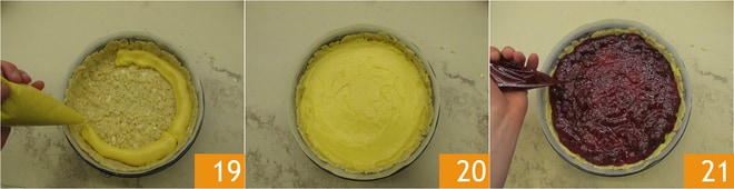 Preencha a forma com o creme pasteleiro 19, se preferir, você pode usar um saco de confeitar para nivelar com uma espátula 20. Cubra com a geleia de morango, usando também aqui um saco de confeitar 21 ou uma colher.