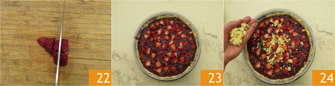 Corte os morangos em pedacinhos 22 e distribua-os sobre a geleia 23. Termine adicionando a massa restante 24.