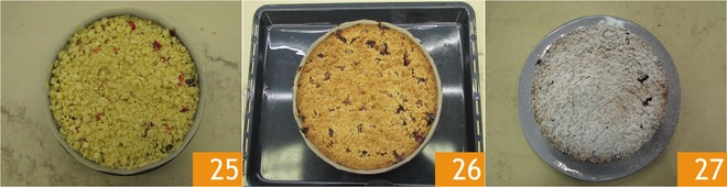 É normal que tudo chegue até a borda da forma ou transborde levemente. Asse a sbriciolada 25 em forno estático pré-aquecido a 180°C por 80 minutos: os primeiros 50 minutos na prateleira média-baixa, nos últimos 30 minutos levante ligeiramente o bolo para dourar. Retire do forno, deixe amornar 26, depois desenforme e polvilhe com açúcar de confeiteiro antes de servir 27.