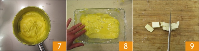Coloque o creme pronto 7 em um recipiente comprido e largo ou uma tigela grande 8, coloque filme plástico por cima em contato e deixe esfriar em temperatura ambiente. Corte a manteiga em cubos para a base 9.