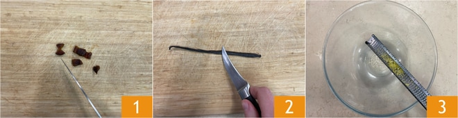 Para preparar a sbrisolona de damascos, comece por eles, cortando-os em cubos não muito pequenos 1. Retire as sementes de uma vagem de baunilha 2 e reserve. Pegue uma tigela grande e rale dentro a casca do limão 3.