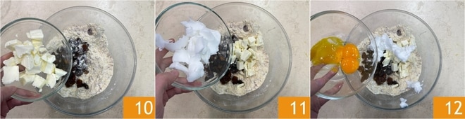 Adicione também a manteiga em cubos 10, a banha 11 e as gemas 12.