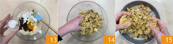Por último, adicione o sal 13 e comece a amassar primeiro com uma espátula e depois com as mãos 14. Você não deve obter uma mistura perfeitamente homogênea, mas os ingredientes devem estar bem misturados. Transfira a mistura para uma forma de 24 cm previamente untada e enfarinhada 15.