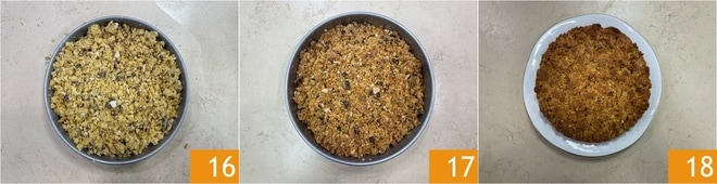 Espalhe bem as migalhas, sem pressioná-las 16. Asse em forno estático pré-aquecido a 170° por 35-40 minutos 17. Assim que estiver bem dourada, retire do forno e polvilhe com um pouco de açúcar refinado 17. Deixe esfriar, desenforme e sirva 18.