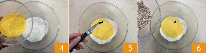 Despeje dentro a farinha de trigo, a farinha de milho 4, as sementes da vagem de baunilha 5 e as amêndoas cruas grosseiramente picadas 6.