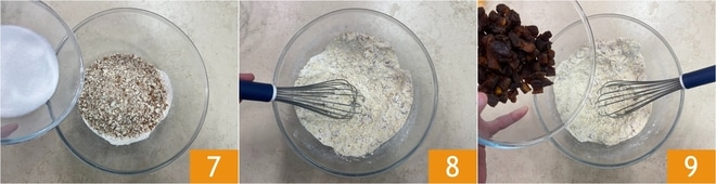 Adicione também o açúcar 7 e misture com um batedor os ingredientes secos 8. Agora adicione os damascos 9.