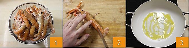 Para preparar os lagostins à busara, primeiro lave bem os lagostins em água corrente fria 1. Com uma faca afiada ou uma tesoura, faça um corte vertical nas costas 2 ou no ventre, para facilitar a extração da carne uma vez cozidos. Se preferir, você também pode deixá-los inteiros. Em uma frigideira grande, doure um dente de alho em azeite de oliva extra-virgem 3;