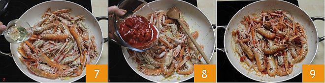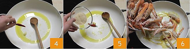 adicione também a pimenta fresca inteira 4. Você pode espetar tanto o alho quanto a pimenta com um palito de dente, para facilitar a remoção ao final do cozimento. Quando o alho estiver dourado, adicione a farinha de rosca 5, que servirá para engrossar a polpa de tomate, e mexa rapidamente para não queimar. Logo depois, adicione os lagostins 6, melhor não sobrepor para uniformizar o cozimento, e