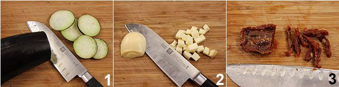Para preparar os pãezinhos achatados com berinjela, scamorza e tomates secos, primeiro lave a berinjela e corte-a em fatias redondas e finas 1. Corte a scamorza em pequenos cubos 2 e finalize cortando os tomates secos em tirinhas 3.