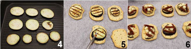 Agora aqueça uma grelha de ferro fundido e grelhe as berinjelas de ambos os lados 4; enquanto isso, disponha os 12 pãezinhos achatados em uma assadeira coberta com papel manteiga. Uma vez prontas, salgue levemente as berinjelas e coloque uma fatia em cada pãozinho achatado (se a fatia ficar muito grande, corte-a ao meio) 5. Tempere cada pãozinho achatado com 3-4 cubos de scamorza e algumas tirinhas de tomate seco 6 e leve ao forno a 180°C por cerca de 5 minutos, até que a scamorza derreta. Complete os petiscos colocando uma folhinha de manjericão em cada pãozinho achatado com berinjela, scamorza e tomates secos!
