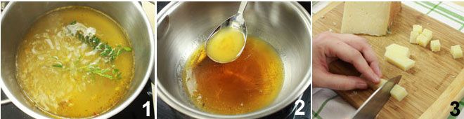 Para preparar as focaccias com pecorino sardo e mel, comece aquecendo o caldo de legumes, depois adicione dois ramos de murta e dois de alecrim 1 e deixe em infusão por cerca de meia hora. Agora, pegue o mel e derreta em banho-maria 2, quando ficar líquido, despeje duas colheres de sopa de caldo e misture bem. Deixe a mistura esfriar e reserve. Pique finamente a murta e o alecrim e corte o pecorino em pequenos cubos 3.