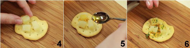 Passe para a composição do petisco: pegue as focaccias e coloque sobre cada uma três cubos de pecorino sardo 4, despeje uma colher de chá de mel 4 e polvilhe com a mistura de murta e alecrim 6.