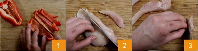 Para preparar os pães achatados com frango à páprica e pimentões vermelhos, comece pelos pimentões. Lave-os em água corrente fria, depois retire a coroa e os divida ao meio. Retire a quantidade necessária para a receita, remova as sementes e corte primeiro em tiras 1, depois em palitos finos de cerca de 4 cm cada um. Coloque-os em uma tigela. Enquanto isso, pegue o peito de frango, retire as partes mais gordurosas, se necessário, e corte-o em tiras 2, depois divida-as novamente 3.
