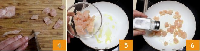 Então corte em pequenos pedaços de pouco mais de 1 cm 4. Em uma frigideira, aqueça um fio de azeite e adicione os pedaços de frango 5. Deixe dourar por alguns instantes, mexendo para dourar de todos os lados. Em seguida, adicione sal a gosto.