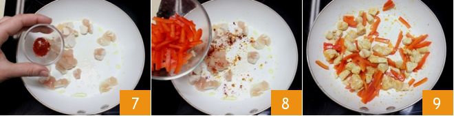Adicione ao frango também a páprica doce (ou picante, se preferir) 7 e depois os pedaços de pimentões que você havia reservado 8. Misture e cozinhe em fogo médio por 15 minutos 9, mexendo frequentemente os ingredientes e, se necessário, você pode adicionar um pouco de água para facilitar o cozimento.