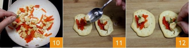 Quando terminar de cozinhar, esmigalhe com as mãos as folhinhas de tomilho fresco na frigideira 10 e desligue o fogo. Deixe o frango à páprica com pimentões esfriar um pouco, depois comece a montar seus pães achatados: use uma colherinha para rechear cada pão achatado 11 e, se desejar, pode adicionar algumas folhinhas de tomilho 12. Sirva seus pães achatados com frango à páprica e pimentões vermelhos como um delicioso finger food!