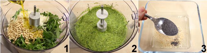 Para preparar as folhadas com atum em crosta, comece com a preparação do pesto de rúcula. Coloque em um mixer a rúcula bem lavada e seca, o Grana Padano e o pecorino, os pinhões, o azeite de oliva extra virgem e uma pitada de sal 1 e bata tudo até obter um molho cremoso 2. Se o molho estiver muito seco, adicione mais azeite. Em seguida, prepare o atum em crosta: em uma tigelinha coloque a farinha de rosca e as sementes de papoula 3