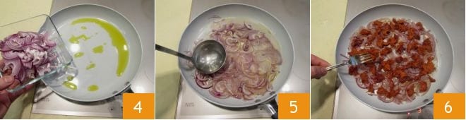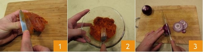Para preparar os scialatielli com a nduja, retire a pele da nduja 1 e coloque-a em uma tigela, amassando com um garfo para amolecê-la 2. Corte a cebola em rodelas 3.
