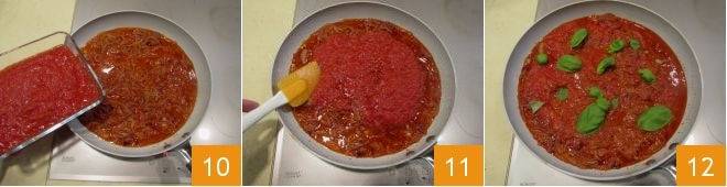 Adicione também a polpa de tomate 10 e deixe cozinhar em fogo moderado por 15 minutos 11, depois finalize adicionando algumas folhas de manjericão 12.