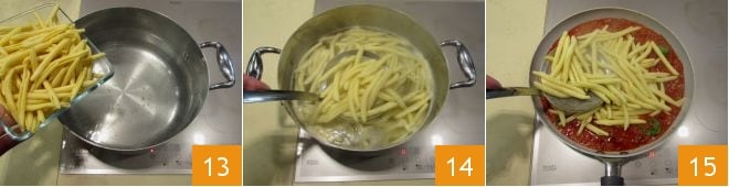 Coloque no fogo uma panela com bastante água salgada e deixe quase ferver. Cozinhe os scialatielli por 11 minutos 13, deixando-os al dente, depois escorra 14, adicione-os diretamente no molho que você preparou 15 e misture para absorver o sabor.