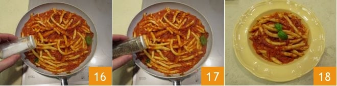 Salteie tudo por alguns instantes e ajuste o sal 16 e a pimenta 17, depois sirva seus scialatielli com a nduja bem quentes 18.
