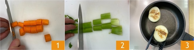Para preparar as scrippelle mbusse, a primeira coisa que você deve fazer é o caldo. Descasque as cenouras e corte-as em pedaços 1, depois faça o mesmo com o aipo 2. Divida a cebola ao meio e doure-a por alguns minutos em uma frigideira antiaderente 3.