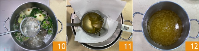 Leve para ferver ajustando a chama no máximo; a partir desse momento, cozinhe em fogo médio por 3 horas. Durante esse tempo, será necessário espumar o caldo, ou seja, remover a gordura e as impurezas que emergirem à superfície 10. Uma vez pronto, filtre o caldo usando uma peneira coberta com papel de cozinha 11. Ajuste o sal do caldo filtrado e mantenha-o quente (para usar a carne cozida, encontre algumas dicas no final da receita) 12.
