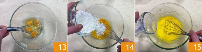 Passe para as scrippelle: em uma tigela, bata os ovos com um batedor manual 13, depois adicione a farinha aos poucos, mexendo continuamente para não formar grumos 14. Despeje a água aos poucos enquanto continua a mexer 15.