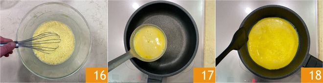 Você deve obter uma massa bem fluida e homogênea 17. Aqueça e unte uma frigideira antiaderente com 16 cm de diâmetro, depois despeje uma concha de massa no centro 17 e gire a frigideira para distribuí-la uniformemente no fundo. Cozinhe por 1-2 minutos em fogo médio-alto, depois vire a scrippella 18 e cozinhe o outro lado pelo mesmo tempo.