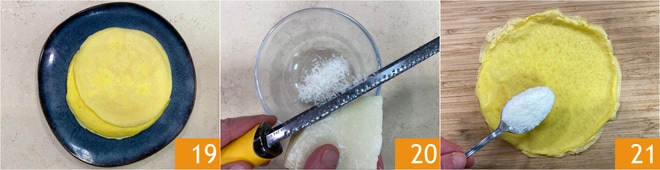 A medida que forem ficando prontas, empilhe as scrippelle em um prato 19; com essas quantidades, você deve obter 12. Agora rale o pecorino 20. Coloque uma scrippella de cada vez sobre a bancada e distribua uma colher de sopa de pecorino ralado no centro 21.