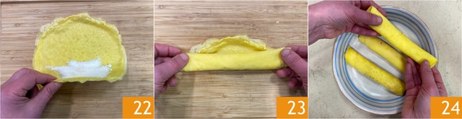 Enrole a scrippella para formar uma espécie de canudo 22 23 e faça o mesmo com todas as outras. Quando todas estiverem prontas, disponha 3 scrippelle enroladas em cada prato fundo 24.