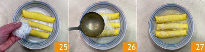 Polvilhe com o pecorino ralado 25 e adicione uma concha de caldo quente 26. Suas scrippelle mbusse estão prontas para serem servidas 27!