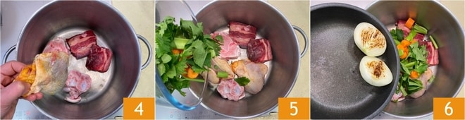 Em uma panela grande, coloque os diferentes tipos de carne 4, depois adicione o aipo com suas folhas, as cenouras 5 e as cebolas douradas 6.