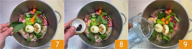 Aromatize com louro 7, bagas de zimbro 8 e cravos-da-índia, depois adicione uma pitada de sal e cubra com água 9.