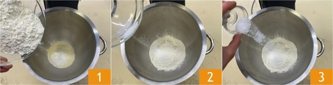 Para preparar as seadas lembre-se de tirar o queijo da geladeira no mesmo dia em que começar a preparar a massa, porque o queijo deve atingir o ponto certo de acidez por cerca de 24 horas. Primeiro, prepare a massa violada (ou violata): na tigela de uma batedeira planetária coloque a sêmola, a farinha 00 1, o açúcar 2 e o sal 3.