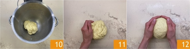 Trabalhe por mais 5 minutos 10, depois transfira para uma superfície de trabalho e amasse com as mãos 11. Forme uma bola 12.