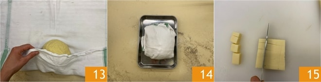 Envolva-a em um pano 13 e deixe descansar por 24 horas na geladeira 14. No dia seguinte, pegue o queijo que deixou fora da geladeira por 24 horas e corte em cubos 15.