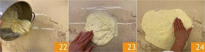 Quando o queijo estiver bem derretido, transfira-o para uma superfície umedecida com água 22. Molhe bem as mãos e pressione delicadamente o queijo 23 até alcançar uma espessura de meio cm 24.
